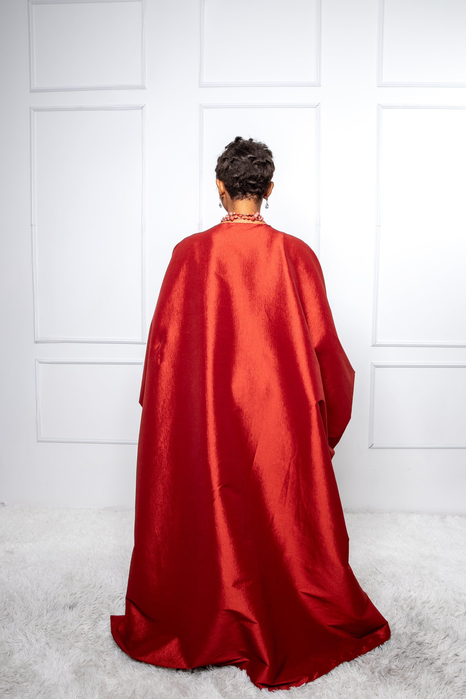 A graceful embodiment of favor and divine elegance. This luminous burnt orange bubu gown is fully reversible, offering two timeless looks in one: one side features a chic V-neckline with a slit, while the other side reveals a classic round neckline with no slit. Both sides are designed with functional pockets and come with an adjustable inner belt to shape the gown as desired.